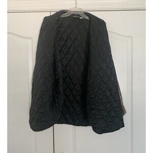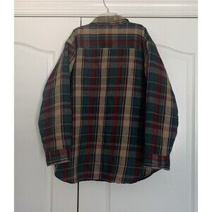 Deer Creek Men's Flannel Plaid Button Down Shirt Jacket/Work Shirt with Black Quilted Lining. Size is XL, multicolor plaid in green, red, blue, black and tan. There are 2 front chest pockets that button shut. No side pockets. The outer shell is 55% Ramie/45% Cotton, quilted lining is 100% Nylon, and the filling is 100% Polyester. Machine Washable. Measurements: Chest: about 28" across from armpit to armpit while lying flat, Sleeve: 24" long from shoulder seam to end of sleeve, Length: 32.5" long down the front from the top of the shoulder to bottom edge.There is some light wear and minor pilling from being worn.