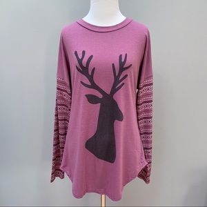 Purple knit longsleeve shirt with elbow patches and deer on front, size small. Oversized, definitely tunic length. Bust measures about 20 inches, length 29 inches. Perfect condition.