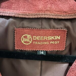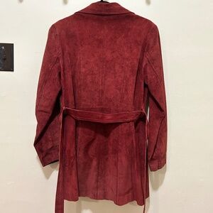 Women's red suede jacket with tie at waist. Size is described as 14 but fits like women's medium