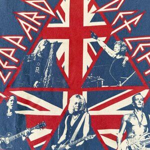 Show off your love for classic rock with this official Def Leppard concert t-shirt from 2017. The medium blue/gray shirt features a bold red and white graphic, showcasing the band's name and the Union Jack flag. It's a great piece for a vintage-inspired streetwear or rock aesthetic, paying homage to the iconic band's 80s and 90s heyday. The tee is a comfortable 100% cotton, in a pullover style with a crew neck. It's in good preloved condition that adds to its authentic, lived-in feel.