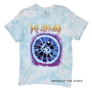 Brand new with tags, this is a Men's size Medium and looks so cute worn oversized on Women. This Def Leppard Adrenalize Blue White Tie Dye Band T-Shirt is a must have for any fan! Sold out and rare, your chance to own it here! This crewneck short sleeve tee has the Adrenalize eye ball graphic in blue, purple and white. Def Leppard logo in red, yellow and black across the chest. Official Def Leppard merchandise.