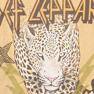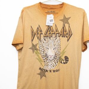 Rock some retro edge with this officially licensed Def Leppard "Stone Band Tee" featuring a distressed, stone-washed look in warm golden tones. The bold front graphic includes a fierce leopard, lightning bolts, and the iconic Def Leppard logo with “Rock N’ Roll” beneath it. Black bedazzled jewel stars add a standout sparkle and texture, giving this shirt extra glam-rock flair. Made from 100% cotton and tagged a size L, it's soft, breathable, and perfect for concerts, casual looks, or collectors of vintage-style band merch.