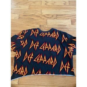 This striking Def Leppard cropped t-shirt showcases a vibrant graphic print, ideal for fans of the iconic rock band. Its short sleeves and relaxed fit provide comfort and style, making it a versatile addition to your casual wardrobe. Measuring approximately 18 inches from top to bottom, it effortlessly combines fashion and fandom.