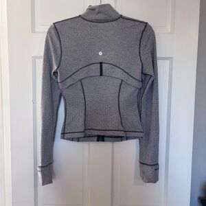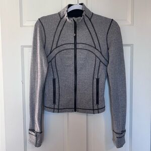 Size 6 cropped define jacket in heathered black & white herringbone.