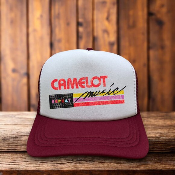 Defunct Camelot Music Mens Trucker Hat Maroon Snapback 1956 Logo Baseball Cap