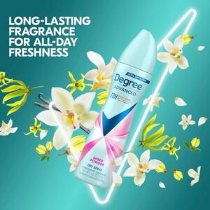 Stock up on long-lasting freshness with this Lot of 6 Degree Advanced Sheer Powder Dry Spray Deodorants. Designed with body-heat activated technology, each spray delivers up to 72 hours of powerful sweat and odor protection, keeping you confidently dry and fresh no matter how active your day gets.
