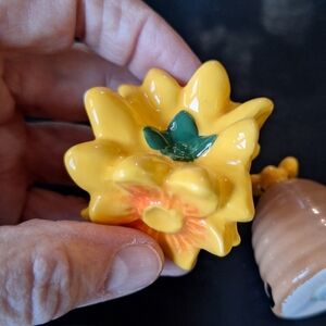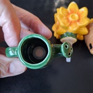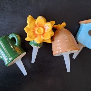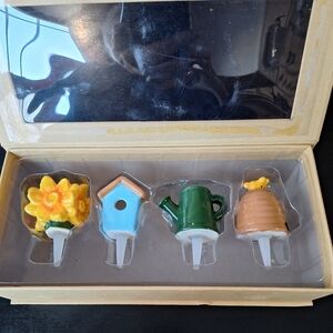 Enhance your collection with the Garden Charmers Set. Featuring vibrant yellow, blue, green, and brown colors, these mini charmers add a touch of whimsy to your home kitchen. Perfect for garden lovers. in original box . box has little water stain as shown in picture doesn't effect anything.
