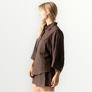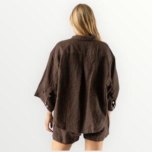 Features an oversized box fit linen shirt with wide arms and a front pocket.