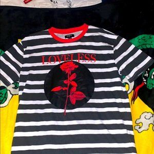 Forever 21 Striped Loveless Rose Graphic Tee (Black) This knit graphic tee features "Loveless'" text, a rose down one of the sleeves, and a crew neck. Chic and on-trend, good with leggings or jeans. Unisex. Size Medium. Brand new with tags! Tags for exposure: madewell tigermist tiger mist iamgia I am gia princess polly oh polly revolve jaded London vintage motel forever 21 boohoo aritzia skims