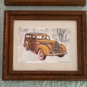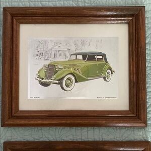 Classic art prints featuring: 1937 Cord, 1935 Auburn, 1940 Packard, and 1925 Franklin cars. Rich coloring and beautiful backgrounds featuring an array of iconic American locations (Mount Vernon, Golden Gate Bridge, etc). Perfect for car enthusiasts. RARE. Including frame measure 10.5x12.5”.