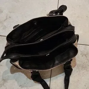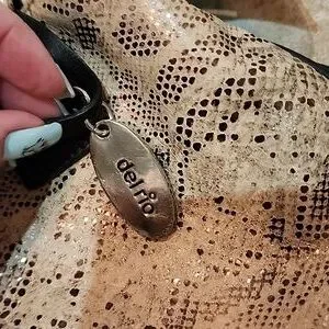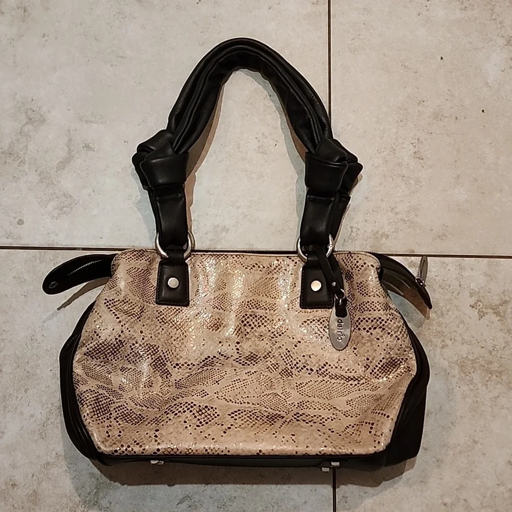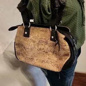 A faux snakeskin pattern with large knotted handles gives this purse a fun twist to a classic satchel style.