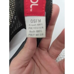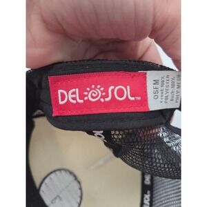 Snap back closure for adjustable fit. Size tag notes OSFM (One Size Fits Most). Interior branded taping and Del Sol red label. Mesh back is noted as 100% poly mesh material for ventilation.