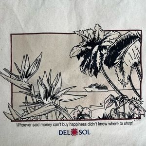 Cotton canvas reusable shopping bag, perfect for quick trips around town. In good condition with a few small marks. — See pics for details. Handles are thick and durable. Says “Whoever said money can’t buy happiness didn’t know where to shop!”
