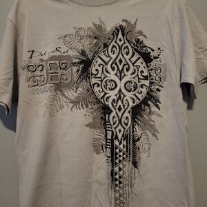 Del Sol men's graphic crew neck t-shirt in size medium. Features a bold tribal-inspired design in black and gray tones on a soft gray background. Made from 100% cotton, this shirt offers all-day comfort and breathability.