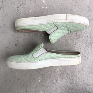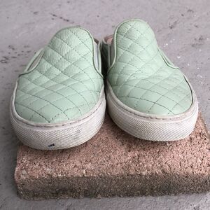 These quilted leather mules are very pale, mint green. Please check out the pictures sidewalls need cleaning. Actual shoes have no damage. Cannot find the size inside them but I put them out at nine. Toe to heel measures 10.5 inches. Made in Italy