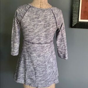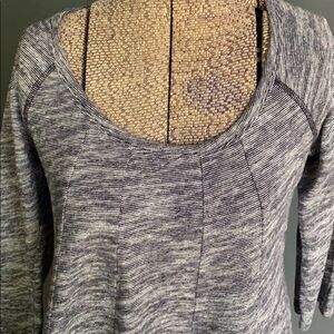 Deletta (Anthropologie) marled navy stretch knit top. Scoop neckline. Raglan bracelet sleeves. Multiple vertical panels create flare towards hem. Back yoke. 100% cotton. Size XS. Excellent condition. Nonsmoking home.