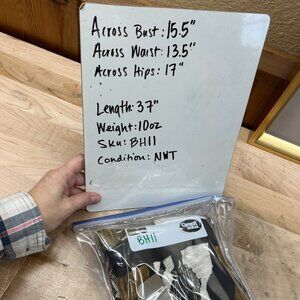 New with tags. Across bust = 15.5", across waist = 13.5", across hips = 17".