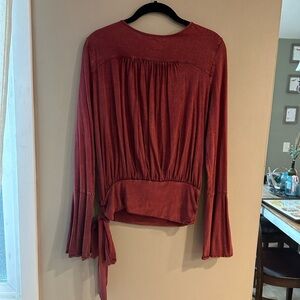 This elegant Deletta blouse features a striking red hue with a sophisticated wrap design and a tie front detail. The long sleeves and waist-length hemline make it perfect for both casual and dressier occasions.