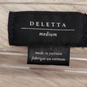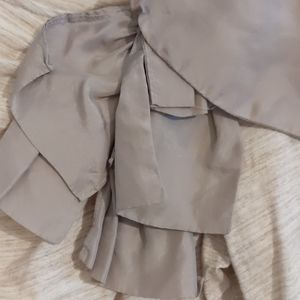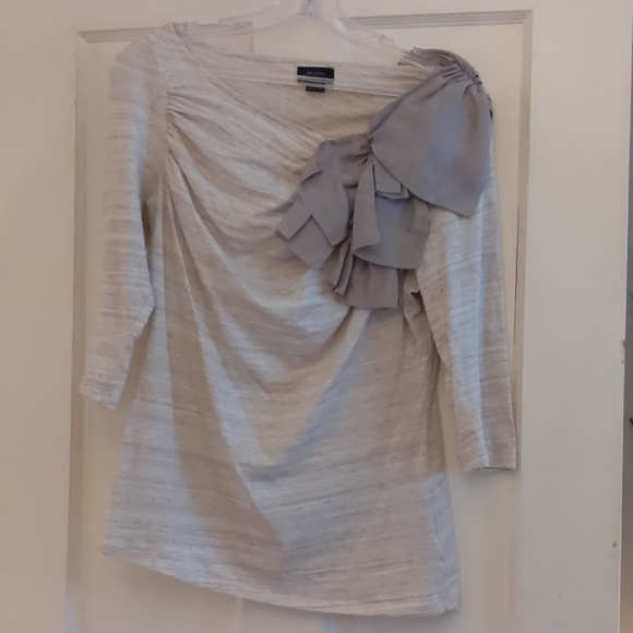 Beautiful top by Deletta from Anthropologie in a heathered oatmeal color with a Cascade of sateen gray ruffles down the left shoulder. Previously loved and does show signs of wear (pilling) under the armpits.