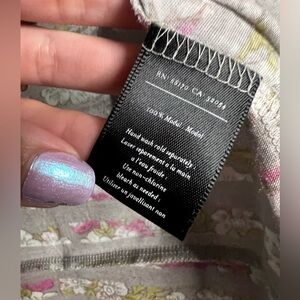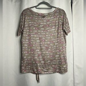 Brand New With Tags. Deletta from Anthropologie Floral Striped Side Tie Top. Grey with stripes of pink and green floral pattern. Features a side tie-front detail. Relaxed fit. Size Small.