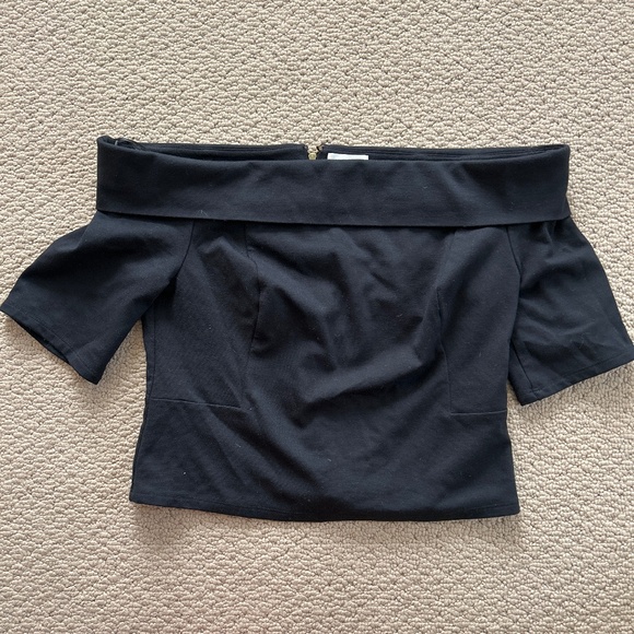 Off the shoulder black top, hangs nicely on, has some stretch to it.