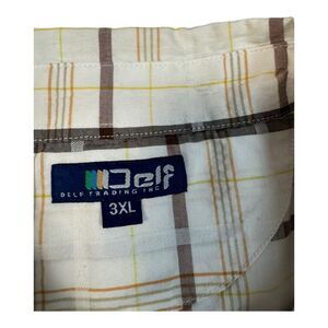 Elevate your style game with Delf Trading Inc's Mens Size 3XL Long Sleeve Beige Striped Brown Button Up Shirt.