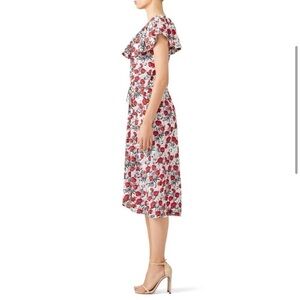 This Delfi Collective Lake Midi Dress features a large all around flutter neckline in a relaxed A-line silhouette. Criss cross bustier waist. Sleeveless. Unlined. Composition: 100% polyester. Back zipper. Made in the United States of America.