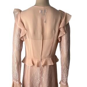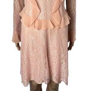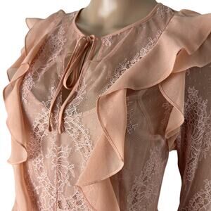 ITEM: Delfi Collective X Anthropologie Luna Ruffle and Lace Sheath Dress - separate slip lining with adjustable spaghetti straps, pullover sheer lace overlay has a hook closure at back, long sleeves, ties at front