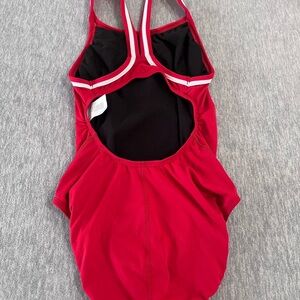 Dive into style with this vibrant red one-piece swimsuit, featuring a high-cut leg and sporty racerback design. The white trim detailing adds a striking contrast, making it perfect for competitive swimming. Crafted from a durable nylon/spandex blend, this suit ensures comfort and performance in the water.