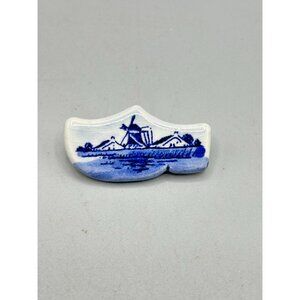 Delft Blue Ceramic Brooch Pin Shoe with Windmill Design Souvenir Jewelry