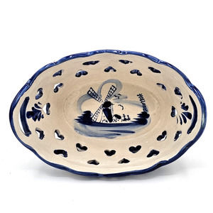 Add a touch of timeless elegance to your home with this vintage Delft hand-painted blue and white ceramic dish. Featuring a charming heart cutout design with delicate handles, this piece is perfect for displaying on a mantle or using as a trinket tray. The iconic windmill motif adds a whimsical touch to this classic piece, making it a lovely addition to any décor. Bring a piece of traditional Dutch craftsmanship into your space with this exquisite vintage find.