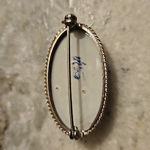 This Delft pin is set in a silvertone setting. Signed on the back. 1-1/2 inches long.