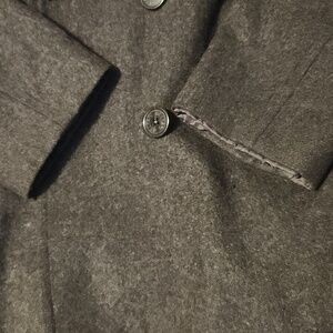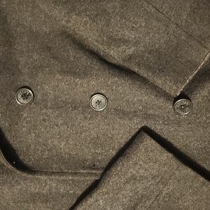 this gently loved peacoat is plenty warm while also being lightweight. beautiful button and tags accents. Charcoal Grey. 2 front flap style pockets. size large. I wanna say this was purchased in 2002