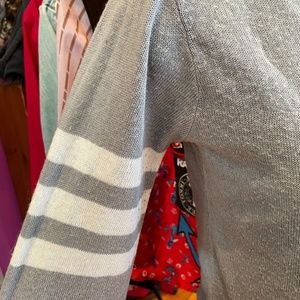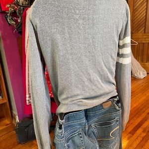 Super cute lightweight sweater by Delia's, junior's size SM. Adorable raccoon graphic on front and 3 white stripes on one sleeve (like it's from a little trash panda college or something!) Worn a bunch and showing it's age (maybe 20 years or more at this point?) Some pilling, slight snag on the front (pictured) & collar is a little... not frayed but frilly.