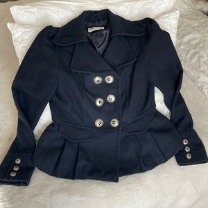 GUC adorable, navy blue pea coat with peplum detail and silver buttons. Faux pockets in front. Such a cute vintage style! Size is small, but would consider this closer to XS/Small.