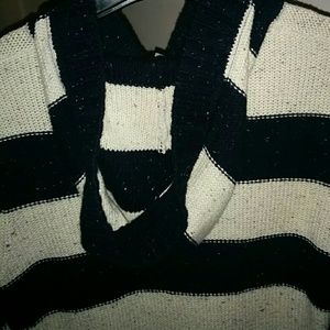 Beige and dark blue striped sweater. Is super cozy and cute! The thread is spotted with pink, blue, red, and yellow. I hate to let it go but it is just way too big and long for me.