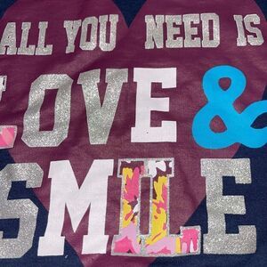 Navy base w/ large burgundy heart graphic “All You Need is Love & Smile” - white and silver accents