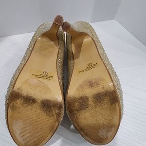 Delicacy Gold Rhinestone platform heels. Gently worn condition, light wear on the bottoms, no other flaws that I can find. Size 7 1" platform height with a 5" heel height.