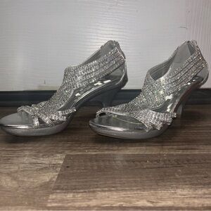 Size 5 1/2 Rhinestone open toe heels by delicacy. Preowned in good condition