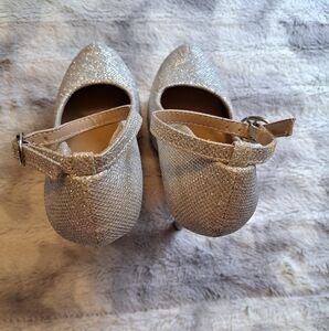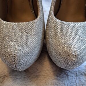 pre owned, very good condition, silver sparkly crystals that you can see from every angle, adjustable ankle strap, 2" platform with a 5" heel