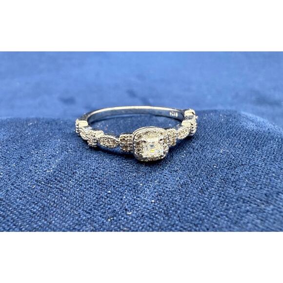 This is a beautiful, vintage-inspired ring featuring a delicate cushion-cut moissanite stone.