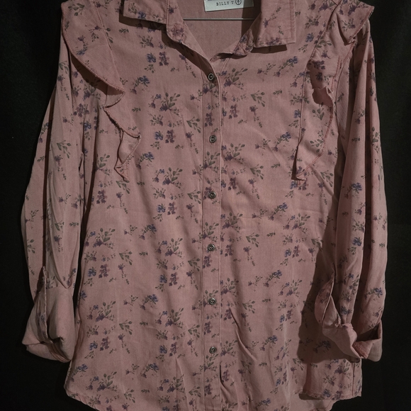 Embrace elegance with this delicate floral blouse. Featuring charming ruffles and a button-up design, it's perfect for any occasion.