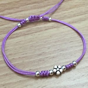 A beautiful silver plated 6x6mm flower with charming silver plated spacers in a handmade adjustable shamballa bracelet. Hand braided using a thin and strong light purple nylon thread. The circumference length of the bracelet can be adjusted from approx. 6 inches up to 9 inches. The perfect addition to your jewelry collection or as a great surprise for any occasion.
