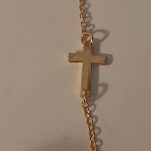 Elegant gold bracelet with a cross charm. Perfect for layering or wearing alone.