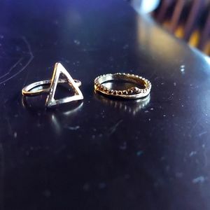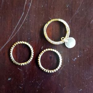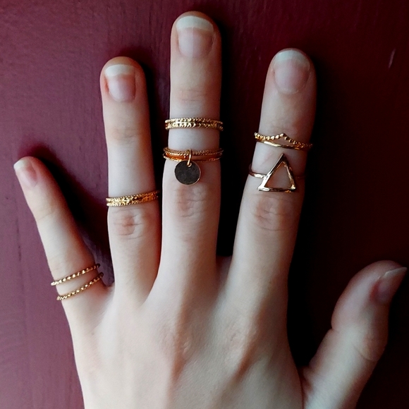 Seven gold-plated rings of various styles and sizes ranging from 4-6. They are from serveral different sets that I previously purchased and do not wear often simply because I don't wear midi or stacking rings (which they work well as!).