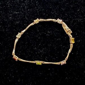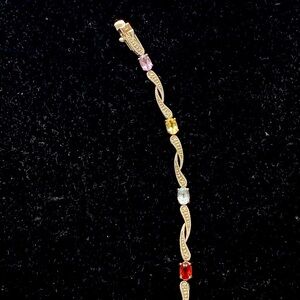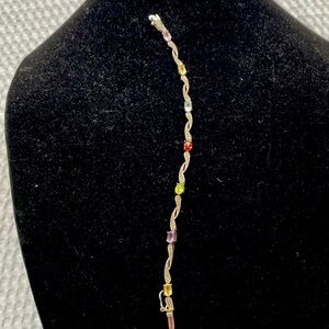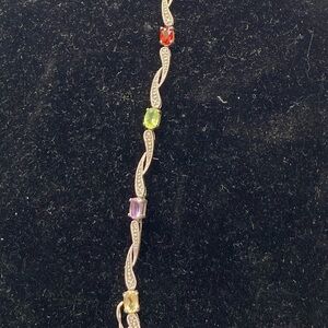 Beautiful silver bracelet featuring colorful gemstones in a wavy design with marcasite. Small stones in a rainbow of colors are set along a twisted silver chain. Perfect accessory for adding a subtle pop of color.