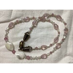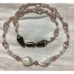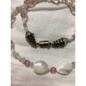 Delicate pink necklace with glass beads and center shells that looks almost like a bow. Measures about 20 inches long. The clasp is magnetic and holds very well. That makes for much easier on and off. No makers mark, could be handmade. In very good condition.
