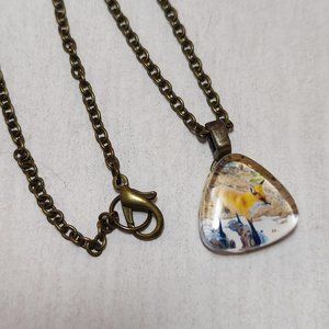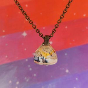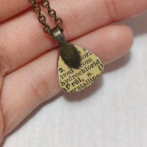 A tiny glass pendant with a photo of a red fox with vintage dictionary paper on the back. Made by me.