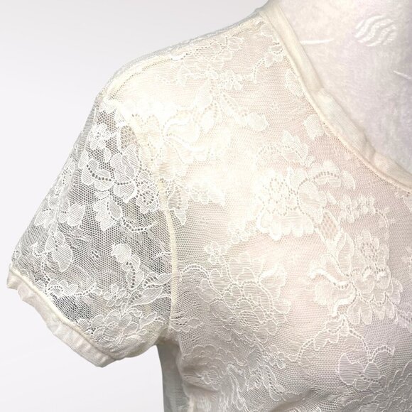 Delicate Sheer Ivory Lace V-Neck Blouse Short Sleeve Top XS Small