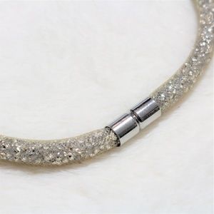 Bling choker 13.5 inches long. inside the mesh are hundreds of crystal nuggets which shine through the Gold mesh casing. The closure is silver with crystal stones and is magnetic.